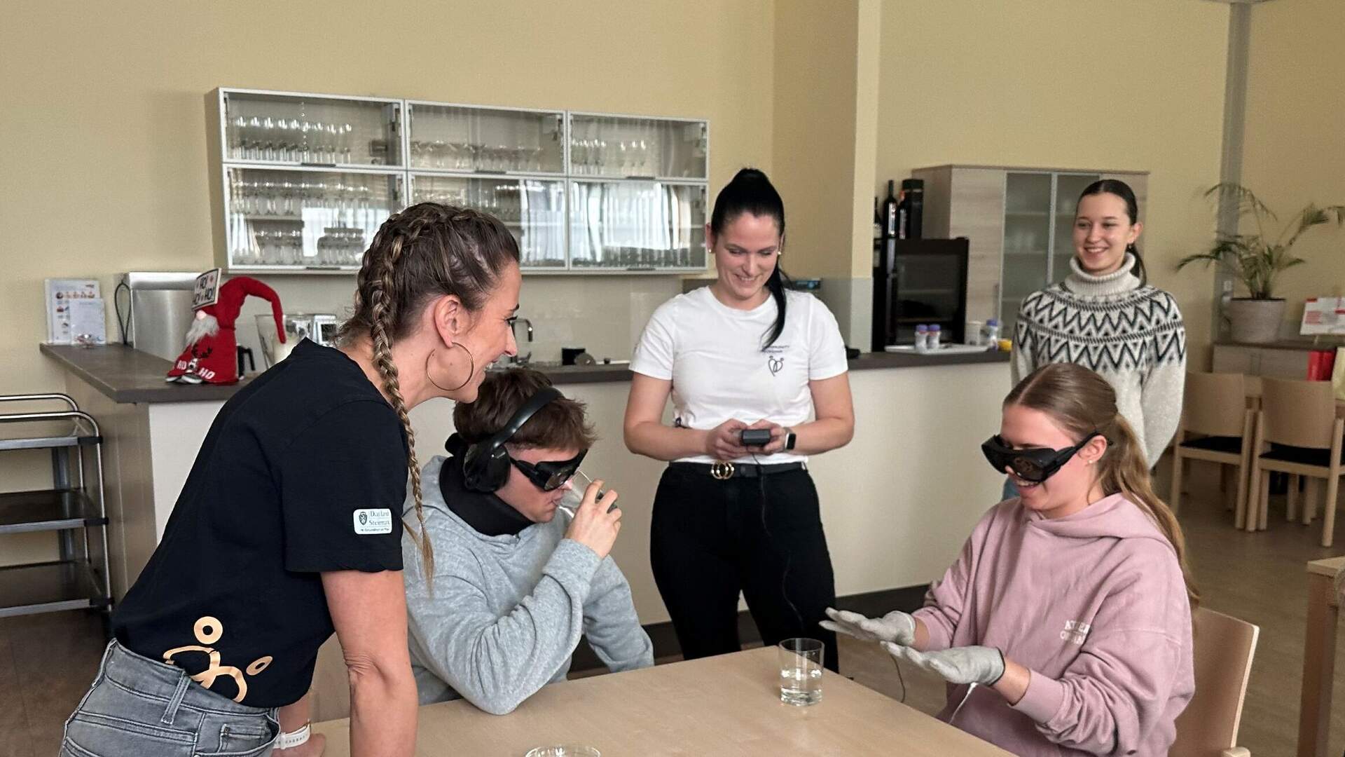 Im Anschluss wurde es anschaulich und praktisch: Die Schülerinnen und Schüler hatten die Möglichkeit, selbst zu erleben, wie sich verschiedene altersbedingte Einschränkungen anfühlen. Mit speziellen Hilfsmitteln konnten unter anderem Augenerkrankungen, Parkinson sowie Schwerhörigkeit simuliert werden. Diese praktischen Erfahrungen sorgten für viele Aha-Momente und förderten das Verständnis und die Empathie für ältere Menschen.