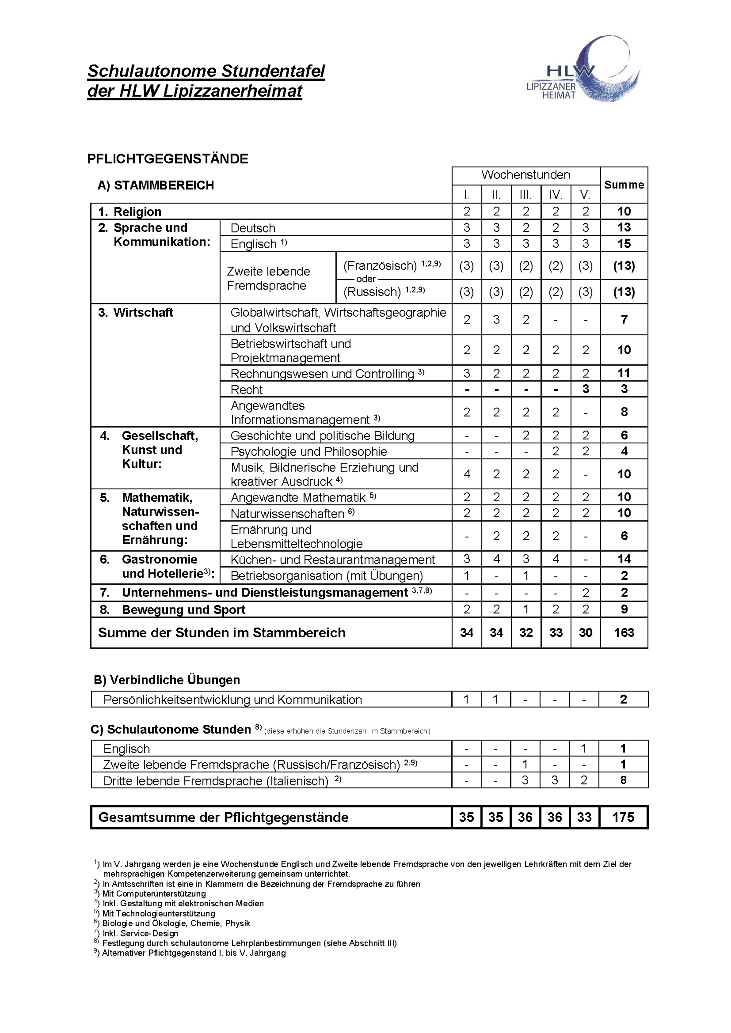 Stundentafel der HLW Lipizzanerheimat